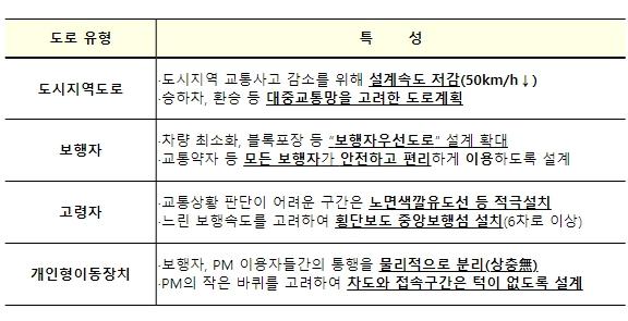 국토부에서는 보행자, 고령운전자, 개인형 이동장치(PM)의 안전환경을 고려하여 도로를 설계할 수 있도록 ’21년 3월 ?사람중심도로 설계지침?을 제정한 바 있다.