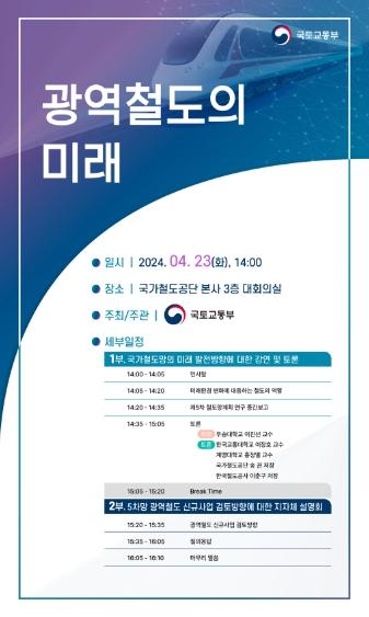 국토교통부는 4월 23일 오후 2시 국가철도공단(대전)에서 ?광역철도의 미래? 세미나를 개최한다.