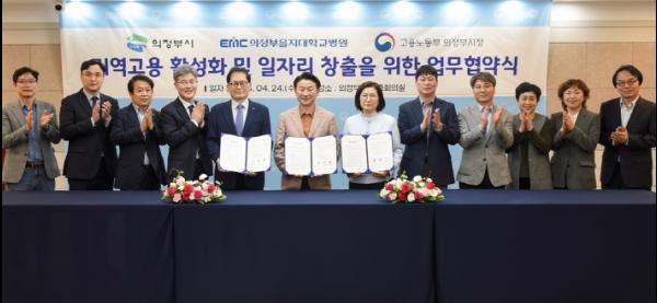 의정부시는 4월 24일 시청 중회의실에서 의정부을지대학교병원, 고용노동부 의정부지청과 ‘지역고용 활성화 및 일자리 창출을 위한 업무협약’을 체결했다.