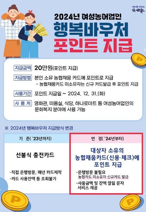 여성농어업인 행복바우처 사업은 문화 여건이 상대적으로 열악한 농어촌 지역 여성농어업인에게 다양한 문화생활을 즐길 수 있도록 1인당 연 20만원의 행복바우처 포인트를 지급하는 사업으로 올해 2월 말까지 신청을 받아 대상자를 선정했다.