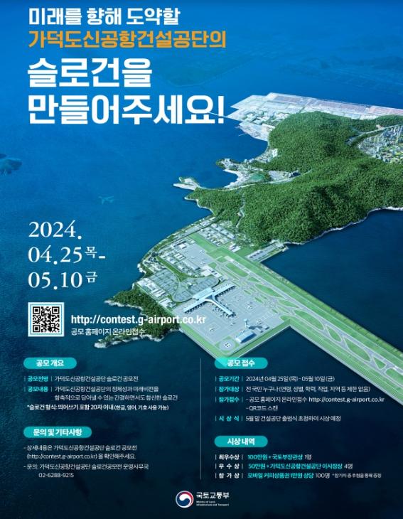 국토교통부는 4월 25일 ?가덕도신공항건설공단법? 시행에 맞춰, 4월 25일부터 5월 10일까지 가덕도신공항건설공단 슬로건 대국민 공모전을 진행한다.