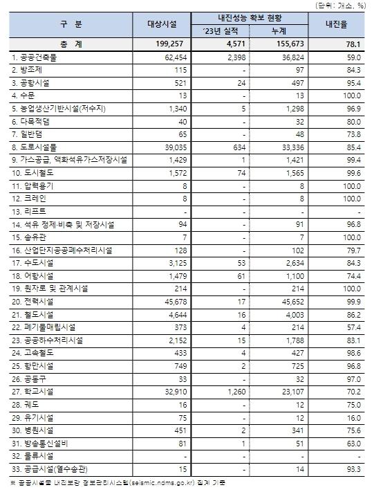 행정안전부는 2023년도 기존 공공시설물에 대한 내진보강대책 추진 결과, 전국 기존 공공시설물 내진율(내진성능 확보율) 78.1%를 달성했다고 밝혔다.