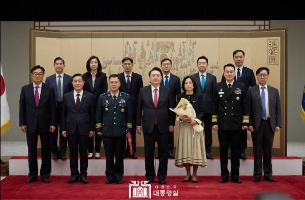 윤석열 대통령은 4월24일 오전 용산 대통령실에서 강호필 신임 합참차장으로부터 진급 및 보직 신고를 받고 삼정검 수치를 수여했다.