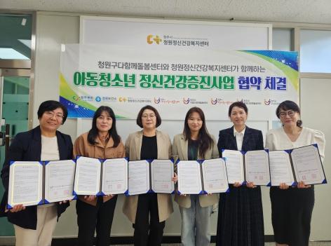 청주시 청원정신건강복지센터는 2024년도 아동의 정신건강증진을 위해 24일 청원구 소재 다함께 돌봄센터 5개소와 업무협약을 체결했다