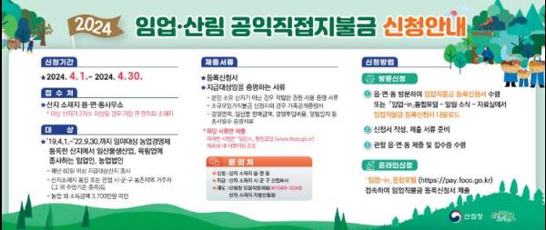 진주시는 4월 1일부터 시작한‘2024년 임업·산림 공익직접지불금’ 신청·접수를 오는 30일 마감한다.