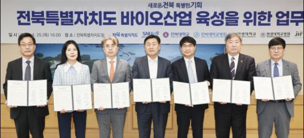 전북특별자치도는 25일 전북자치도청 회의실에서 김관영 전북특별자치도지사와 분당서울대학교병원 전영태 부원장, 전북대학교 안국찬 부총장, 원광대학교 박성태 총장, 전북대병원 유희철 병원장, 원광대병원 서일영 병원장 등이 참석한 가운데 전북 바이오산업 육성을 위한 업무협약을 체결했다.