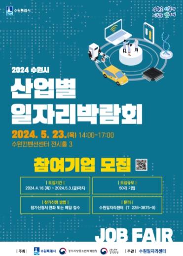 수원시가 ‘2024 수원시 산업별 일자리박람회’에 참여할 기업을 5월 3일까지 모집한다.