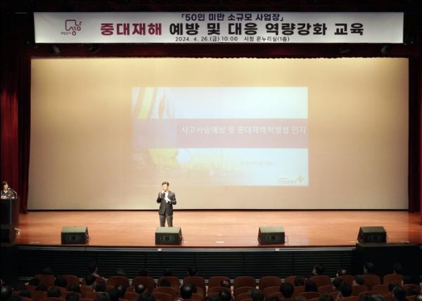 성남시는 26일 오전 10시부터 11시30분까지 시청 온누리실에서 소규모 사업장 사업주 등 약 500명을 대상으로 중대재해 예방 및 대응 역량강화 교육을 실시했다.