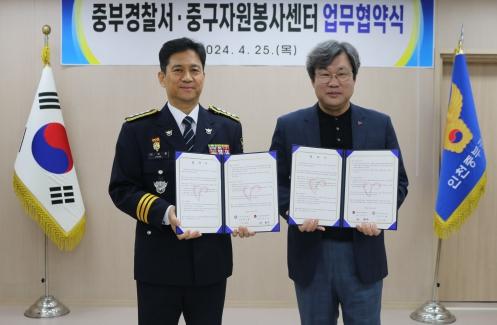 인천광역시중구자원봉사센터는 인천중부경찰서와 중부경찰서 회의실에서 ‘사회공헌 활동 및 안전한 중구 만들기’ 사업 공동 추진을 위한 업무협약을 체결했다고 26일 밝혔다.
