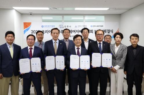 진주시는 26일 서울 송파구 올림픽회관 신관 2층 회의실에서 대한배구협회와 ‘2025 코리아컵 진주 국제여자배구대회’의 원활한 추진을 위한 업무협약을 체결했다.