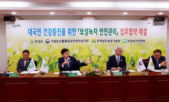 보성군과 국립농산물품질관리원 전남지원은 26일 전라남도 농업기술원, 보성녹차연합회와 함께 보성군청 소회의실에서 대국민 건강 증진을 위한 ‘보성녹차 안전관리’ 업무 협약을 체결했다고 밝혔다.
