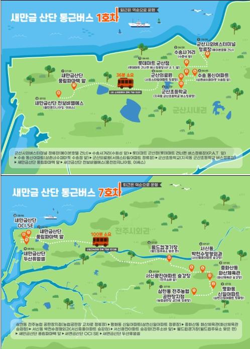 통근 버스 지도를 살펴보면, 군산 시내권 5개 노선과 전주시와 익산시 등 시외권 2개 노선으로 총 70여 개소의 승·하차지를 순회한다.