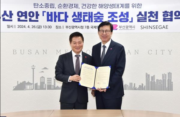 부산시는 지난 26일 오후 1시 30분 시청 국제의전실에서 ㈜신세계와 '부산연안 바다 생태숲 조성 실천 협약'을 체결했다고 밝혔다.