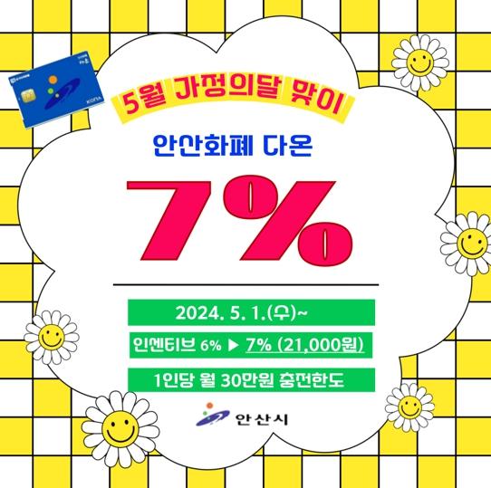 안산시는 오는 5월 가정의 달을 맞아 안산 지역화폐 다온의 인센티브를 기존 6%에서 7%로 1%p 상향 조정한다고 27일 밝혔다.