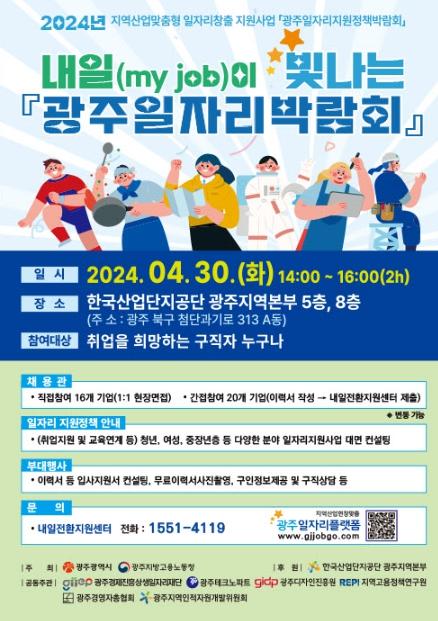 광주광역시는 30일 오후 2시 한국산업단지공단 광주지역본부에서 ‘내일(my job)이 빛나는 광주일자리박람회’를 연다.