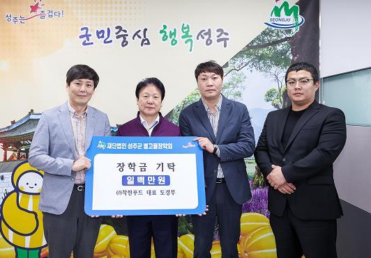 지난 29일 주식회사 착한푸드에서 지역인재를 위한 장학금 1백만원을 (재)성주군별고을장학회에 기탁하였다.