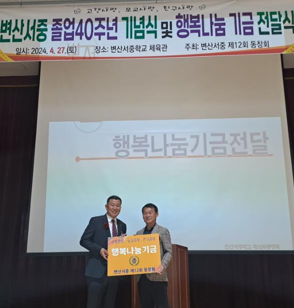변산면에 위치한 변산서중 제12회 동창회는 지난 27일 졸업40주년을 맞아 행복나눔기금 300만원을 기탁했다.