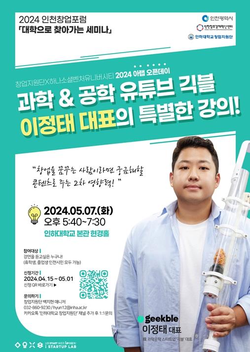 인천광역시는 오는 5월 7일 인하대학교 현경홀에서 창업에 도전하는 지역 청년들과 소통을 확대하기 위해 ‘대학으로 찾아가는 세미나’를 개최하고 구독자 117만 유튜버이자 과학공학 스타트업 긱블의 이정태 대표를 강연자로 초대한다고 밝혔다.
