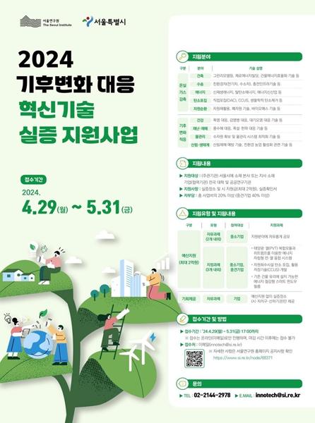 지원 분야는 ?온실가스 감축(건축, 수송, 에너지, 탄소포집, 자원순환)과 ?기후변화 적응(건강, 재난·재해, 물관리, 산림·생태계)으로, 시제품 제작과 실용화할 수 있는 제품 또는 서비스를 가진 서울 소재 기업·대학·연구기관이라면 지원할 수 있다.
