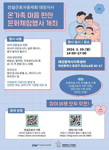 행사는 무료로 진행되며 영유아부터 초등학생 자녀가 있는 가족 100명(건설근로자 가족 70명, 대전시민 가족 30명)을 선착순 모집한다. 건설근로자는 네이버 설문조사 링크를 통해, 대전시민은 가족센터 블로그를 통해 신청할 수 있다.