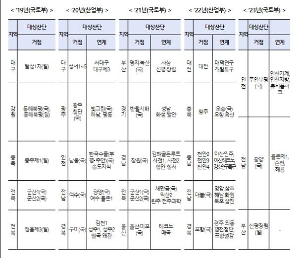 이에 정부는 2019년부터 총 23개 지역을 ‘노후거점산업단지 경쟁력강화사업지구’로 지정하고 관련 부처 및 지자체의 사업을 연계하여 노후 산업단지의 디지털?저탄소화, 근로?정주여건 개선 등을 지원해오고 있다.
