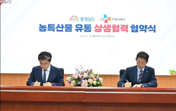 김태흠 지사는 29일 도청 대회의실에서 정성필 CJ프레시웨이 대표와 충남 농특산물 유통 활성화를 위한 상생 협력 협약을 체결했다.