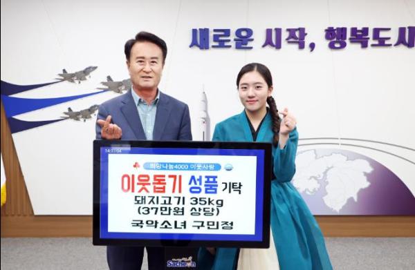 사천 출신 국악소녀 구민정(사남초 6) 학생이 29일 사천시청을 방문해 삼한노인대학 무료급식소에 매달 돼지고기 35kg(37만 원 상당)을 기탁하겠다는 의사를 밝혔다.