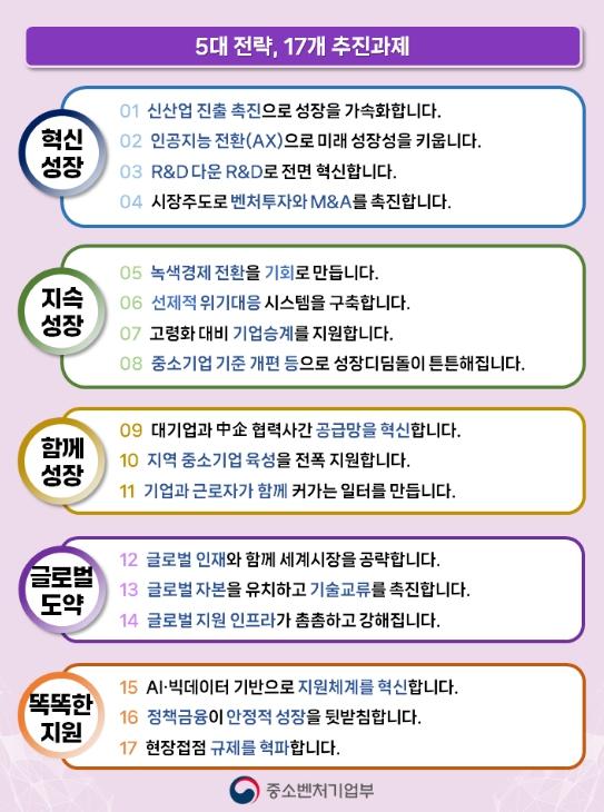 중소벤처기업부는 중소기업의 새로운 도약을 위한 전략을 발표했다. 이번 발표는 중소기업의 ‘혁신 성장’, ‘지속 성장’, ‘함께 성장’, ‘세계적(글로벌) 도약’, ‘똑똑한 지원’을 5대 전략으로 하여 중장기 중소기업 정책 방향을 담았다.