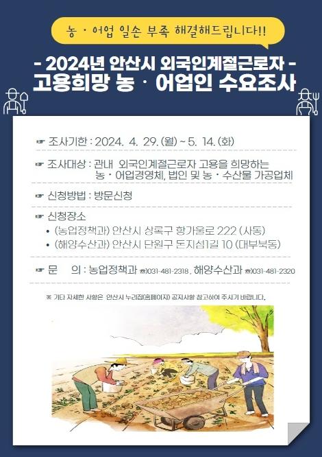 올해부터는 대부도 지역의 어업 분야 인력난을 해소하고자 어업 부분 고용을 확대한다. 시는 외국인 계절근로자의 지역사회 적응을 위해 ▲한국 생활에 필요한 기초 법·질서와 인권 및 성희롱 예방 교육 ▲건강·산재보험료 지원 ▲원활한 인력 관리시스템 지원 등 고용주와 근로자 간의 처우에 온 힘을 다할 계획이다.