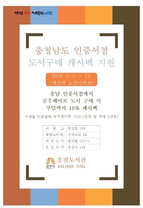 이 사업은 충청남도가 인증한 공주 지역 서점에서 공주페이로 도서를 구입할 경우 구매 누적 결제액의 10%를 구매일 다음 달에 공주페이 캐시백으로 지원하는 내용이다.