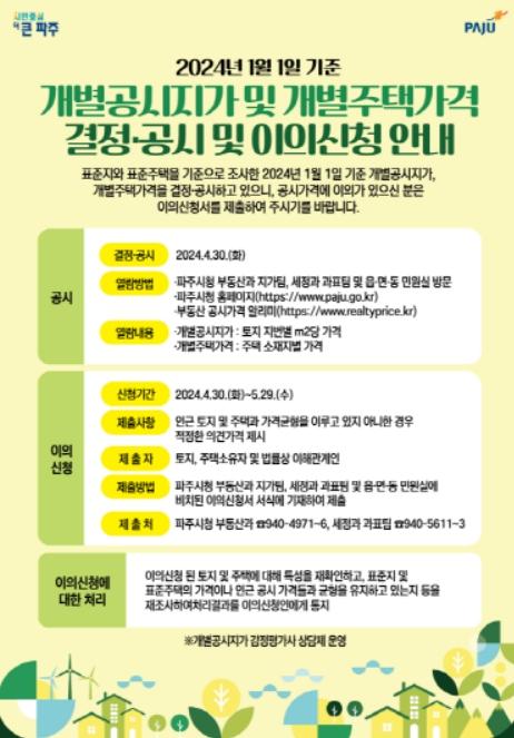 이번에 결정된 개별공시지가는 파주시 누리집 또는 부동산공시가격알리미에서 확인할 수 있다. 열람 후 이의가 있는 경우, 5월 29일까지 이의신청하면 된다.