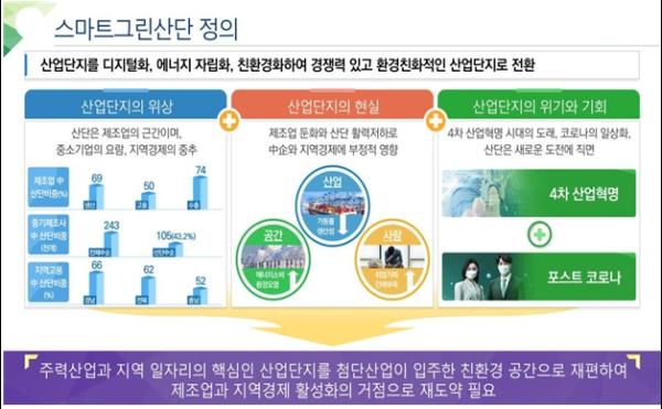스마트그린산단사업은 기존 산업에 ICT·지식서비스산업을 융·복합하여 스마트공장 구축을 통해 제조공정과 제품의 첨단화로 기업의 생산성을 제고하고 산단 내 다양한 편의시설 확충과 근로환경 개선으로 근로자 삶의 질을 향상, 기술창업과 신산업 육성으로 미래형 산업단지를 조성하기 위한 것이다.
