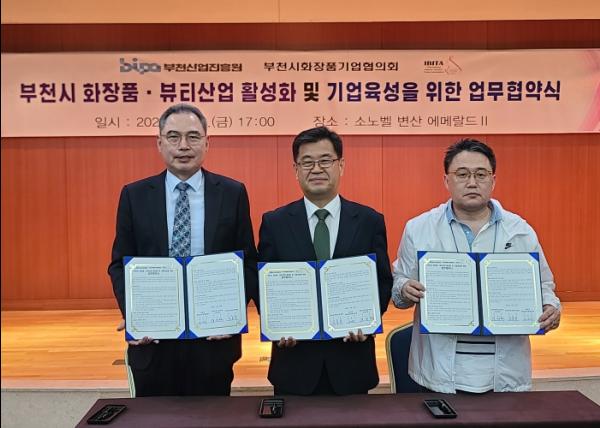 부천산업진흥원은 지난 26일 부천시화장품기업협의회 통합워크숍에서 부천시화장품기업협의회, 국제뷰티산업교역협회와 ‘부천시 화장품·뷰티산업 활성화 및 기업육성’을 위해 업무협약을 체결했다.