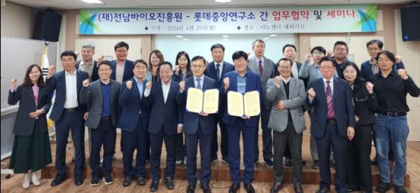 전남바이오진흥원은 국내 최고 바이오 및 종합식품연구소인 롯데중앙연구소와 전략적 헙업체계 구축을 위해 ‘바이오 연구개발 혁신과 기술산업화를 가속화하기 위한 업무협약’을 했다고 밝혔다.