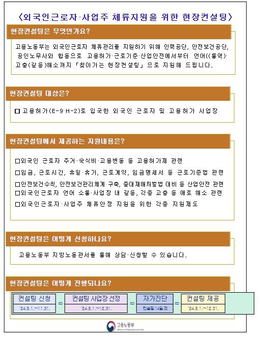 고용노동부는 외국인 근로자(E-9, H-2) 고용사업장을 직접 찾아 체류 관리를 지원하는 현장 컨설팅을 ‘24년 5월부터 12월까지 전국 지방노동관서에서 일제히 실시한다고 밝혔다.