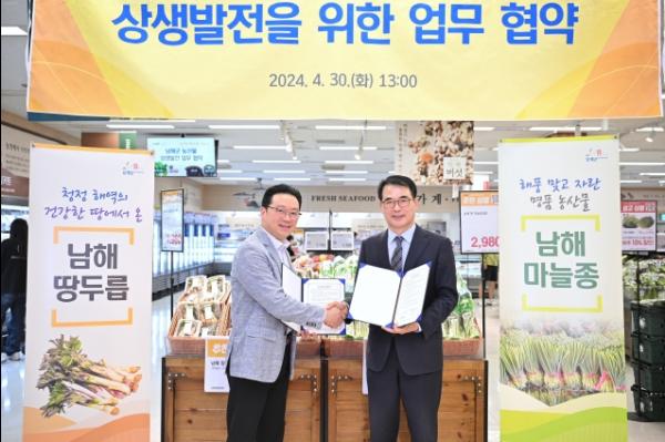 남해군과 이마트는 4월 30일 대구 이마트 월배점에서 농산물 판매 및 홍보를 위한 업무협약(MOU)을 체결했다. 이는 지난해 4월 체결한 첫 업무협약에 이은 두 번째 상생 다짐의 장으로, 보물초와 마늘종 등 품질 좋은 남해군 농산물의 판로 확대에 크게 기여할 것으로 기대된다.