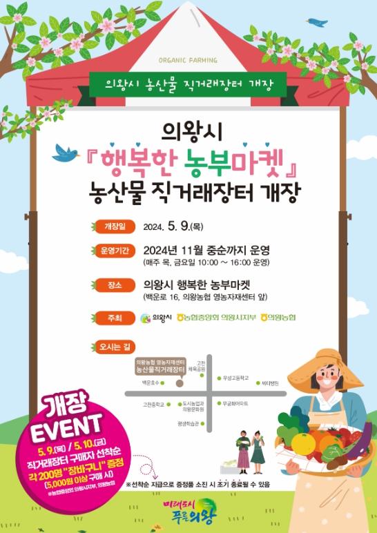 의왕시는 농산물 직거래 장터 ‘행복한 농부마켓’을 오는 5월 9일 개장한다고 밝혔다.