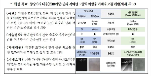 금번 2차로 공고될 과제는 모빌리티 분야는 ?비?안개 등 악천후에서도 정확하게 볼 수 있는 자율주행 센서?카메라, ?96%이상 하이니켈계 이차전지, ?메탄올 추진선 엔진 핵심부품 개발 등이 포함됐다.