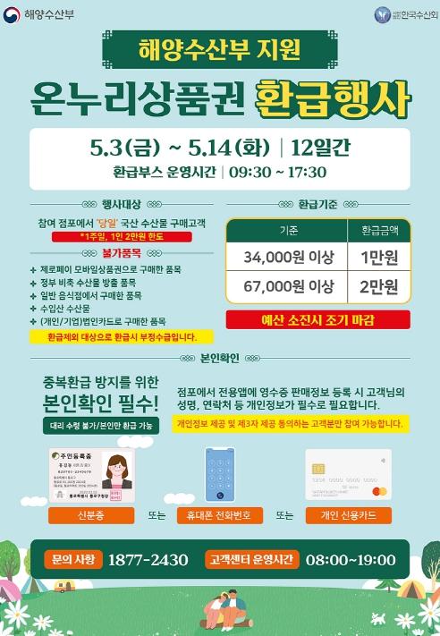 대구농수산물유통관리공사는 5월 황금연휴를 맞아 국내산 수산물 소비를 촉진하고 도매시장 활성화를 위해 수산물 구입 금액의 30%를 온누리상품권으로 환급(최대 2만 원)해 주는 행사를 시행한다.