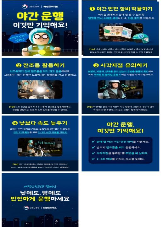 첫 캠페인 주제는 ‘야간운행 안전수칙’으로 야간 운행 시 안전장비 착용, 저속 운행, 사각지점 꼼꼼히 살피기 등을 카드뉴스로 제작하여 배민 중개 앱 등을 통해 중점 안내하고 있으며(4월~), 5월부터 고용노동부 누리소통망(SNS) 등에도 게시될 예정이다.
