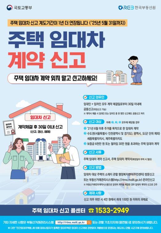 거제시는 주택임대차(전월세) 신고제의 계도기간을 오는 6월 1일부터 2025년 5월 31일까지 1년 추가 연장한다고 밝혔다.