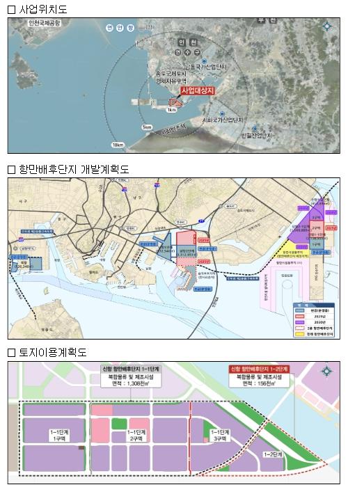 인천신항 항만배후단지 민간개발사업은 2021년부터 2028년까지 총 2,018억 원을 투입하여 인천신항 일원에 복합물류시설, 업무편의시설, 공공시설 등 배후단지 94만㎡를 조성하는 사업으로, 제반비용을 제외하고 민간사업자가 투자한 총사업비만큼 물류부지를 취득할 수 있다.