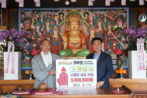 대한불교관음종 연대사(주지 법수스님)에서는 지난 1일 부산 남구에 부처님 오신 날을 맞이하여 이웃돕기성금 500만원을 전달하였다.