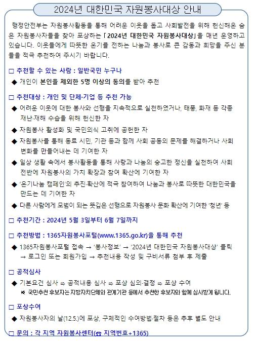 행정안전부는 국가와 사회에 헌신한 숨은 자원봉사자를 찾아 포상하는 ‘2024년 대한민국 자원봉사대상’ 후보자를 5월 3일부터 6월 7일까지 접수한다고 밝혔다.