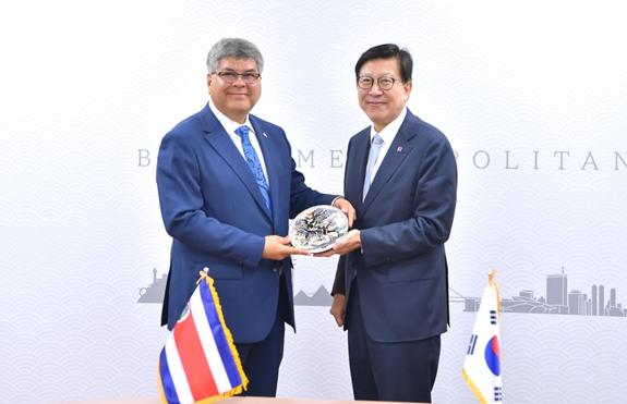 박형준 부산시장은 오늘(3일) 오전 10시 시청 국제의전실에서 호르헤 엔리께 발레리오 에르난데스(Jorge Enrique Valerio Hern?ndez) 주한코스타리카대사를 만나, 부산-코스타리카 간 교류 및 협력 방안을 논의했다.