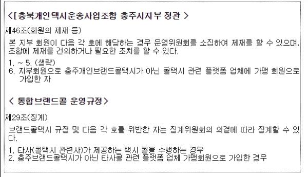 충주시지부는 정관과 운영규정에 충주브랜드콜*이 아닌 다른 사업자의 콜서비스를 수행하거나 다른 사업자의 플랫폼에 가맹회원으로 가입한 회원을 제재할 수 있다는 규정을 포함하여 시행하고, 이를 위반할 경우 제재할 것이라는 내용을 구성사업자들에게 통지했다.