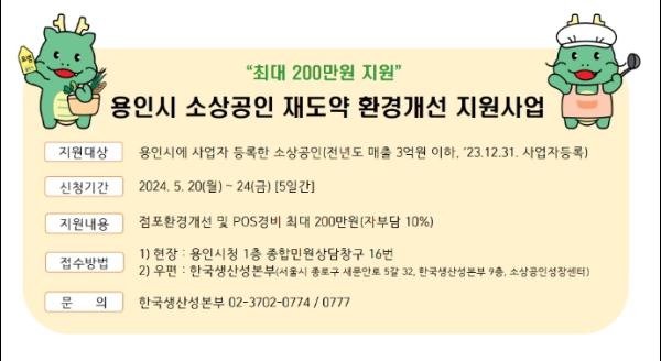 시 관계자는 “소비심리 위축으로 경영에 어려움을 겪는 소상공인을 돕기 위해 마련된 지원사업에 많은 참여를 바란다”며 “이 사업이 소상공인 점포 환경을 개선하고 용인의 골목상권과 민생경제 활성화 계기가 될 것으로 기대한다”고 말했다.
