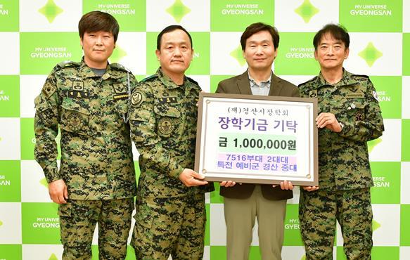 (재)경산시장학회는 7516부대 2대대 특전 예비군 경산 중대가 7일 시청을 방문해 인재 육성을 위한 장학금 1백만원을 기탁했다고 밝혔다.