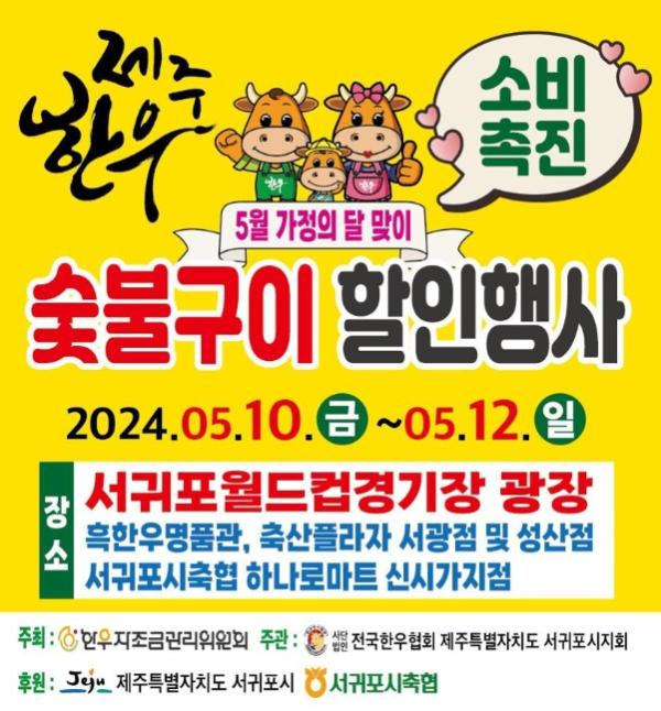 서귀포시는 5월 가정의 달을 맞이하여 축산물의 수급 안정을 가하고, 원자재가격 인상으로 어려움을 겪고 있는 양축농가를 지원하고자 오는 5월 10일부터 12일까지 3일간 제주월드컵경기장 광장에서 제주한우 소비촉진 할인행사를 추진한다고 밝혔다.