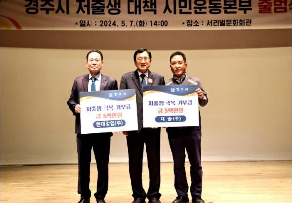 현대강업㈜, 대승㈜은 지난 7일 서라벌 문화회관에서 열린 저출생극복을 위한 시민운동본부 출범식에서 상금 1000만원(각 500만원)을 기탁했다.